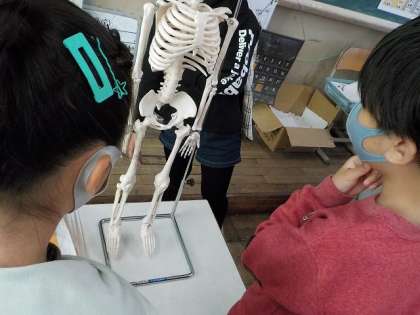 人体模型を見て「確かにここに骨がある」と自分の体を触ってみたり,「こんなところに骨があったんだ」と気づいたりしていました。