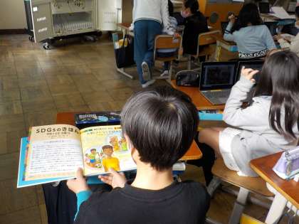 総合で,SDGsについて学習しています。それぞれ興味をもったテーマを選んで,グループで新聞にまとめたりタブレットを活用してスライドショーにまとめたりしています。未来に向けてよりよい環境を築いていくために,自分たちでできることを考えたりいろいろな学年に広めたりしていきます。