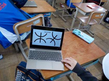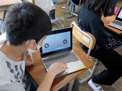 プレゼンテーションを使って,見つけた地図記号を回転させ,点対称かどうかを確かめました。