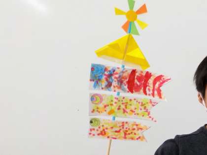 あと,持ち帰り用の小さな「こいのぼり」も作りました。絵の具を綿棒でトントンと打ってウロコをかきました。