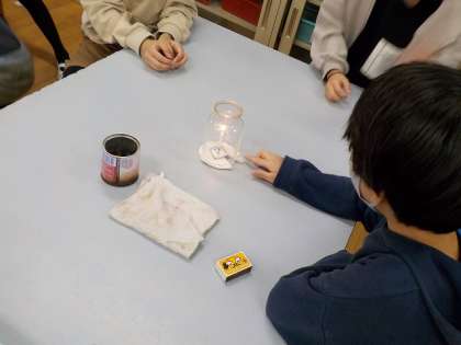 日の扱いに気を付けながら実験をし,空気の入れ替わりが燃えるには必要だということに気付いていました。