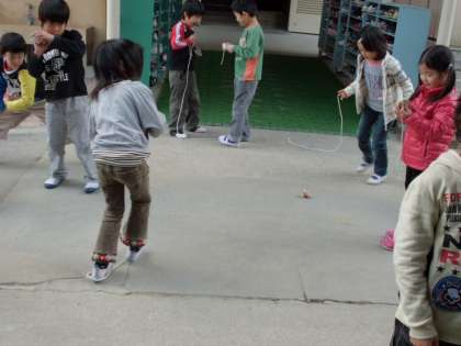 中庭で1年生がこまを回していました。紐が上手に巻けない子もいましたが,何回か挑戦して回せるようになりました。