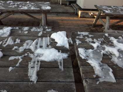 2月20日 おはようございます。中庭のテーブルには,土曜日に降った雪がまだ残っています。今朝の気温はマイナス2度とかなり低いです。池の水も凍っています。寒さに負けずに元気に登校してください。