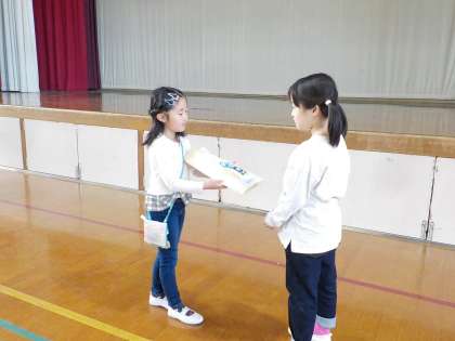 はじめに2年生からアサガオの種のプレゼントをもらいました。すてきな入れ物でみんなびっくり!
