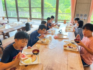 みんな元気に朝食を食べています。バイキングも3回目なのでおかずの取り方も慣れてきました。今日はこの後「ゴシ谷ハイク」があるのでしっかり食べておきましょう。