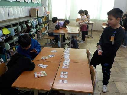 算数の学習でお金の勉強をしたので,一人ずつ財布を持ってお買い物ごっこを楽しみました。
