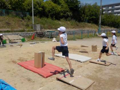 今日は段ボールを置いて高く跳ぶ練習と、マットを置いて遠くへ跳ぶ練習や、それを合わせた高く・遠く跳ぶ練習をすると、自己ベストがたくさん出ました!みんな楽しそうに活動できました!