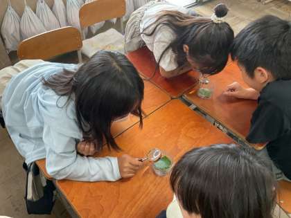 理科ではモンシロチョウの成長について学習しています。キャベツ畑で見つけた卵からは幼虫がうまれました。虫メガネで観察するとキャベツをむしゃむしゃ食べている様子がしっかり確認できました!