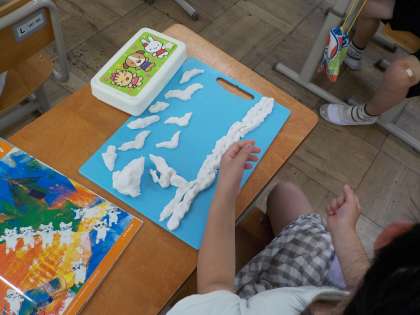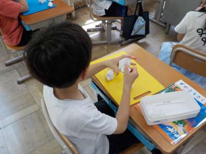 図工「にぎにぎねん土」の学習で、粘土をぎゅっと握ったりにぎにぎしたりしてできた形から、自分で想像を膨らまして作品を作りました。みんな楽しそうに活動していました。
