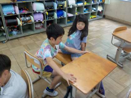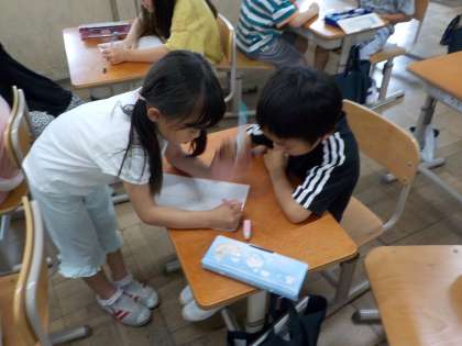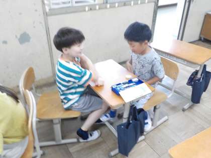 5月23日(金)の1年生との校外学習に向けて、大蛇が池公園でどんな遊びをするかをペアで話し合いました。1年生も2年生も楽しめるような遊びを考えていました。