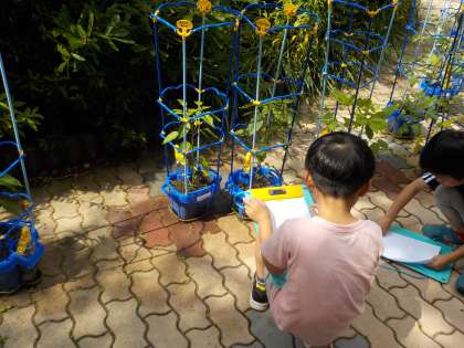 国語「かんさつ名人になろう」の学習で、観察記録を書くために、自分が育てている野菜の観察をしました。大きさや葉や花の様子、触った感じなど細かく観察して、メモを取りました。この後、そのメモをもとに観察記録を書いていきます。みんな真剣に観察をして、たくさんメモを取っていました。