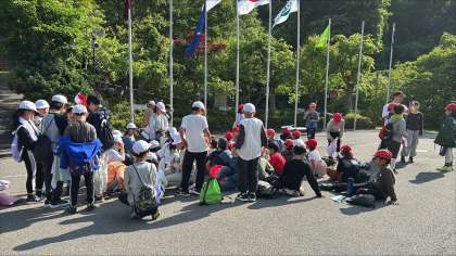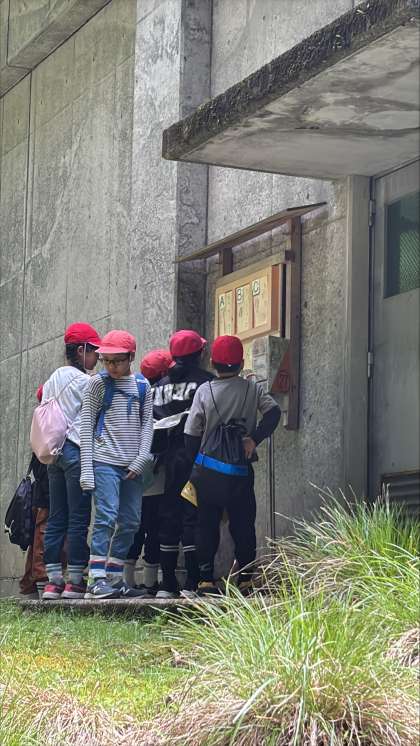 スコアオリエンテーリングの活動も終了しました。正面玄関に集まりふりかえりをしています。次はシーツを受取りいよいよ各部屋に行きます。