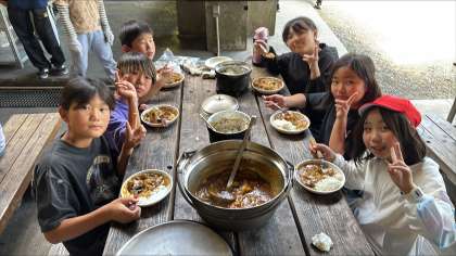野外炊事で作ったカレーを食べました。お味のほうは・・・・素敵な子どもたちの顔から安易に想像できますね、