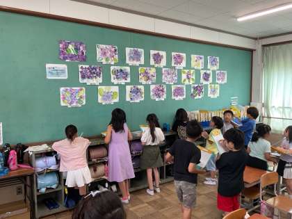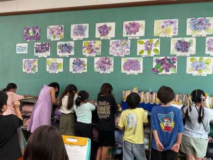 図工科では水彩絵の具のにじみをつかってアジサイを描きました。作品の工夫されているところや次回試してみたいポイントなどを丁寧に鑑賞することができました。