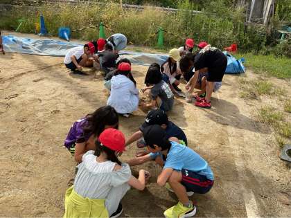 1kgの重さを体感するために、袋に砂を詰めて重さを量る活動をしました。ぴったり1kgを量れたかな?