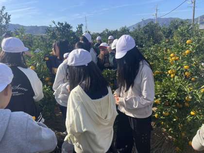 たくさんのミカンの横で記念撮影。これはいい思いです。