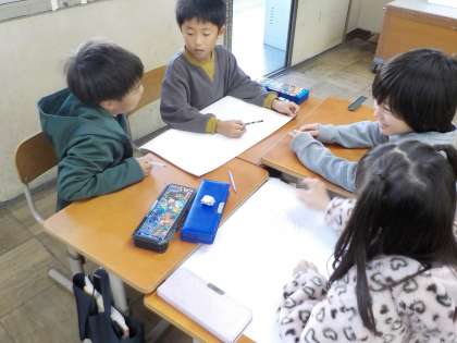 1年生と遊ぶための準備が進んでいます。この日は、何の遊びをするのかがわかるために看板作りをしました。みんな1年生がたくさん来てくれるように頑張って書きました。