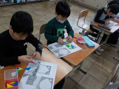 算数ではかたちづくりの学習にはいりました。いろいたを使って様々なかたちをつくりました。