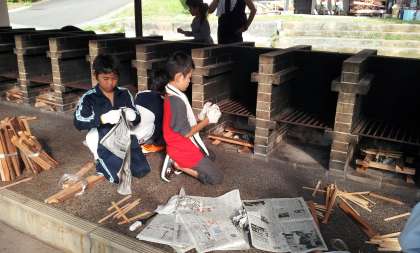 夕飯の準備をはじめました。材料を切ったりカマドの準備をしています。