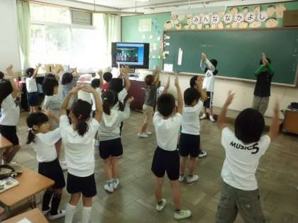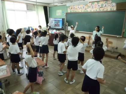 朝休みの時間を使って,全校ダンスの練習をしています。1年生も高学年の人に教えてもらいながら,楽しそうに踊っていました。