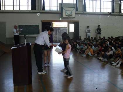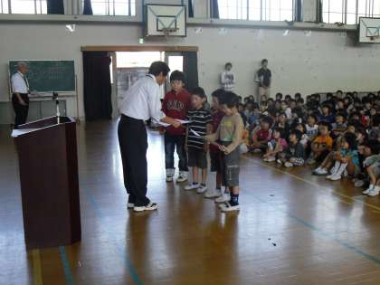 今朝は前期の終業式がありました。校長先生の前期を振り返るお話の後に,賞状の贈呈式が行われました。子どもたちに前期後半に届いた賞状が渡されました。その後,校長先生から全員に,今後に向けての励ましのことばがかけられました。