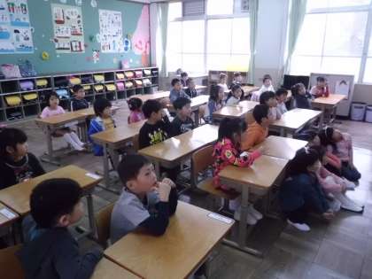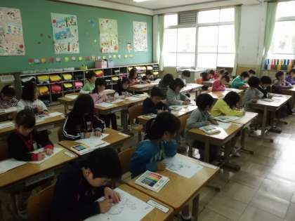 朝一番,1年生の教室に行きました。1組はプリントの色塗り,2組は絵本の読み聞かせでした。楽しく学校生活がおくれそうです。