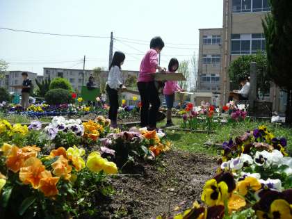 3年生が花の観察をしていました。外にいると暑いぐらいのお天気の中,春の花の造りを調べていました。どの子も一生懸命みて描いていました。
