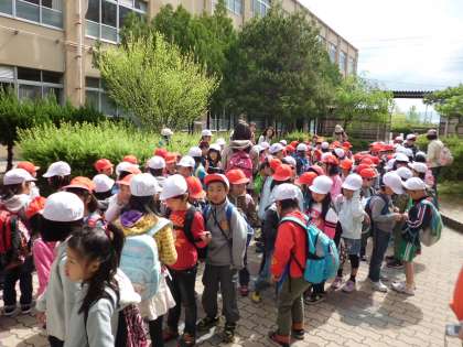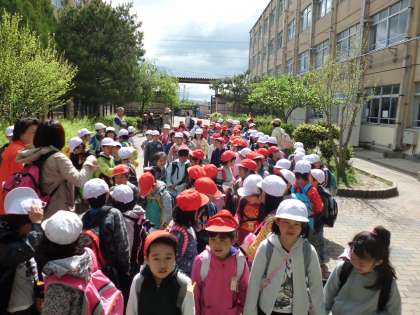 予定通り9時30分に学校を出発しました。少し風があり寒いですが,子どもたちは元気に出かけました。