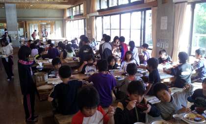 お風呂に入ってさっぱりした後,またまた美味しい夕食です。子どもたちはバイキングを楽しんでいます。