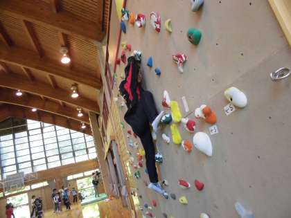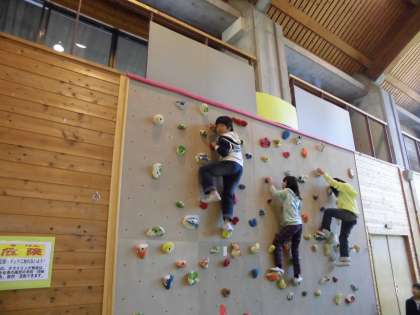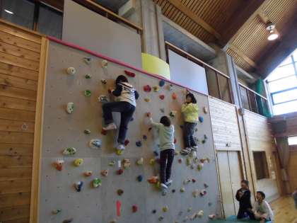 午前中の活動はクラス別に行いました。1組はクライミングに挑戦しました。はじめに低い方で練習をしました。次は7mの高さに挑戦です。命綱を締めて登りました。怖かったけど楽しく挑戦することができました。