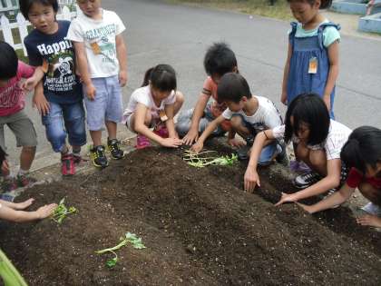 2年生では、生活科で野菜を育てています。ミニトマトはぐんぐん育って、赤い実ができてきています。今日は、さつまいもの苗を畑に植えました。「ミニトマトと違ってくきがつるつるしてる!」「さつまいもは横に倒して植えるんや」と、野菜によって違うところがあることにも気づくことができました。秋においしいさつまいもがたくさんできますように!