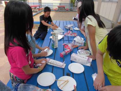 今週のアウトドアクラブは,パックドック作りです。アルミホイルでパンを包み,牛乳パックに入れて焼くだけの簡単な料理です。長期宿泊学習でも食べましたが,手軽においしく食べられるのがいいですね。