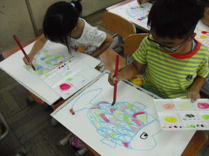 図工で、魚の絵を描きました。うろこの一枚一枚をていねいに色づけして、世界に一匹の自分だけの魚が完成しました。教室がまるでスイミーの海のように楽しい海の世界になりました。