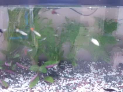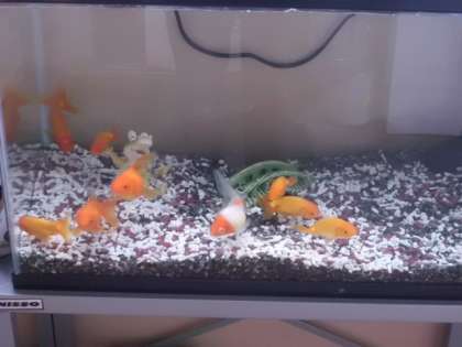 用務員室の前に60センチの水槽を用意し、魚を飼育しました。可愛い熱帯魚と金魚が泳いでいます。もう一つの水槽には小畑川の魚を入れる予定です。ご来校の折にご覧ください。