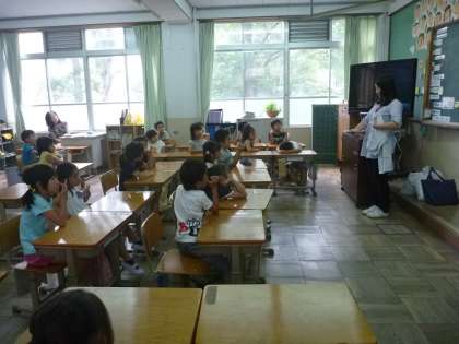 今日は1年2組が栄養教諭の先生に給食指導をしてもらいました。