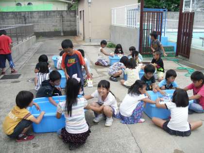 先週作った作品を水に浮かべて遊びました。水にうまく浮くものもあれば、バランスをくずして転覆するものも・・・でも自分の作品で楽しく遊べてうれしそうでした。