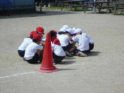 1組VS2組で、おきかえリレーとおりかえしリレーを頑張っています。おきかえリレーは、玉を上手に置きます。おりかえしリレーは、バトンの渡し方を工夫します。勝つためにチームで作戦を考えています。