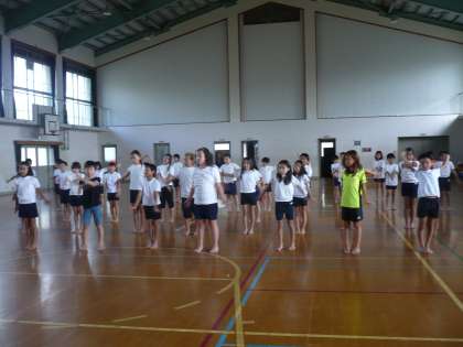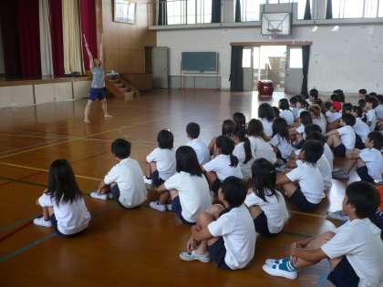太鼓の音に合わせて,体を大きく楽しく動かします。