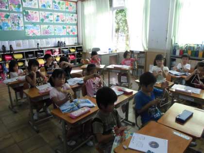 1年生にとって、音楽の時間は、とってもとっても楽しみな時間です。今日は、トライアングルとすずをつかって、たんやたたのリズムあそびをしました。