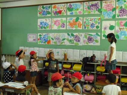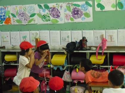 国語「くじらぐも」の第2場面で、子どもたちとくじらぐもの掛け合いの場面があります。班で役割分担をして、くじらぐもに向かって「おうい。」、くじらぐもが子どもたちに向かって「おうい。」と呼び合いました。