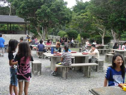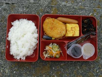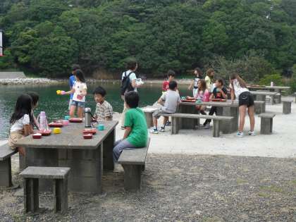 昼食は野外炊飯場で食べました。すぐ横が海なので景色がとてもいいです。今回も子どもたちはしっかり食べました。天気は曇ってきました。