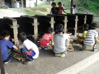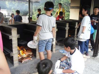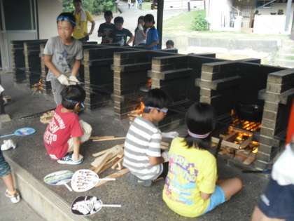 かまどの係りの子どもたちは「暑い暑い」と言いながら頑張っていました。どの班のかまども上手に手際よくできました。約40分ほどでできました。