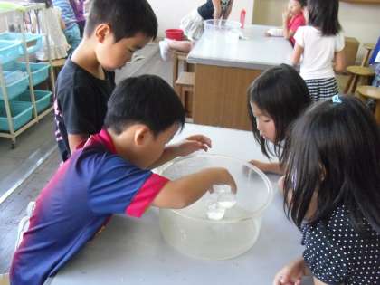 算数「おおきさくらべ」ので、今日は「かさくらべ」をしました。どちらの容器が、水がたくさん入るのかを予想した後、1つの容器にいっぱいに水を入れ、それを別の容器に入れて比べたり、同じ大きさのビーカーにそれぞれを入れて比べたりしました。