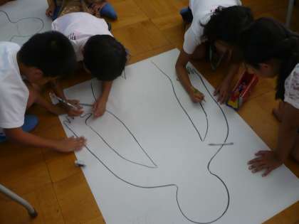 グループで実際に,体のりんかくの中に骨をかき入れました。