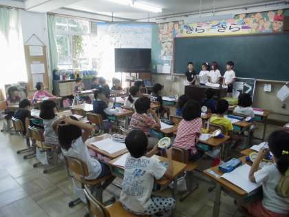 国語で「わたしたちの学校行事」という学習をしています。どんなふうに説明をすれば,1年生にわかりやすく伝わるかを考えました。グループごとに発表内容を考えて,発表メモを作り,練習をしてきました。今日は各グループの運動会,昔遊び,6年生を送る会などの「わたしたちの学校行事」を1年生に説明をしにいきました。1年生のみなさん,ありがとうございました。