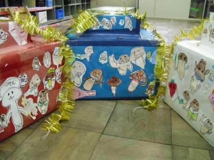 運動会の「なめこ☆フライングゲット」のおみこしが完成しました。大好きななめこのキャラクターを描き、ぺたぺたと貼り、なめこバージョンおみこしの出来上がり!