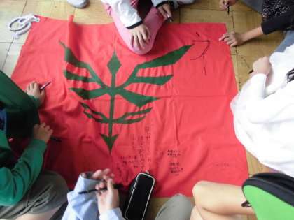 騎馬戦で使用する旗に、一人ずつ意気込みを書き込みました。