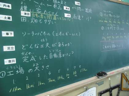 社会では自動車組み立て工場について班対抗クイズをしました。
