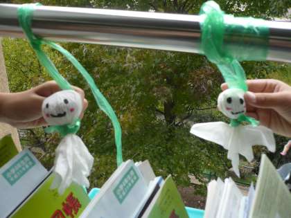 ふと見ると,窓のところにてるてるぼうずが作ってありました。