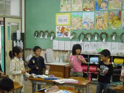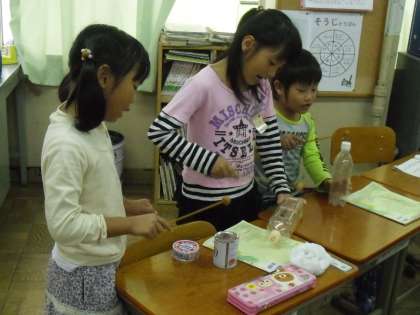 楽器づくり第3弾として、今日は「うつ」楽器をつくりました。あきかんやペットボトルをばちで打ちました。大きさによって音が違いました。班ごとに曲に合わせて打ったり、振ったりして手作り楽器の合奏を楽しみました。